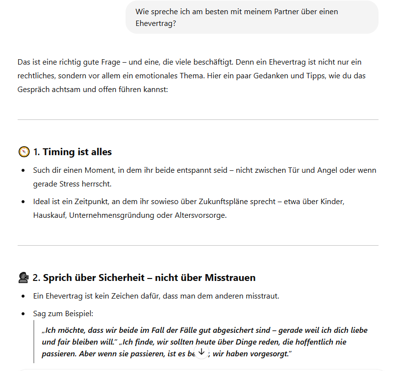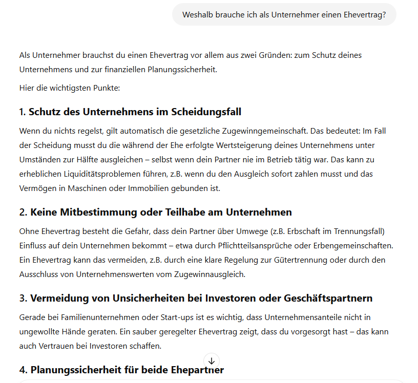Frag den GPT, was in deiner konkreten Situation wichtig sein könnte. Denn das ist es was dich interessiert und nicht unbedingt alle Details zur Technik von Eheverträgen.