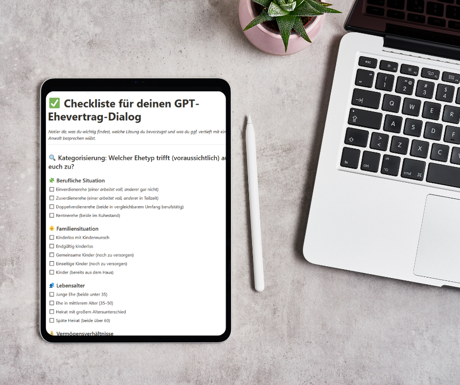 Checkliste für Fragen an den GPT für den schnellen Überblick und einen effizienten Umgang mit dem Ehevertrag-GPT.